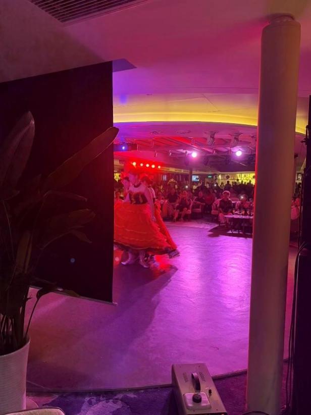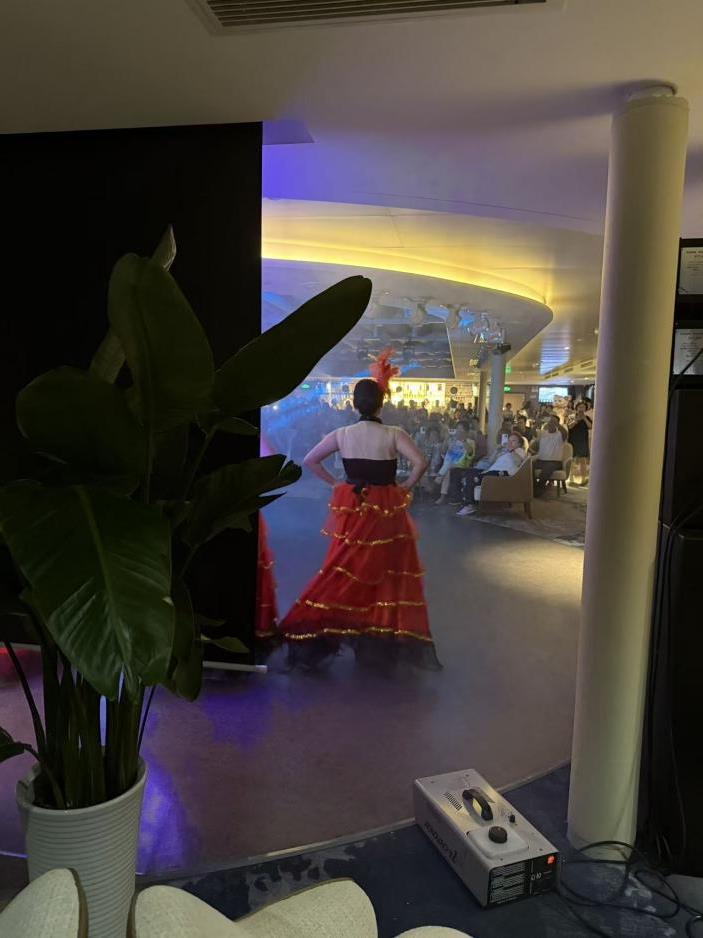 星際阿波羅號遊輪的整體服務也特別好,下船和上船時都會叮囑大家小心腳下,遊覽完景點回船還備了熱毛巾擦手,第二天晚上船上舉行了船長見面會和文藝表演,第三天晚上也安排了遊客才藝表演,讓每個晚上都有娛樂項目。因為到6樓會場的時間晚,只拍到舞臺后面。