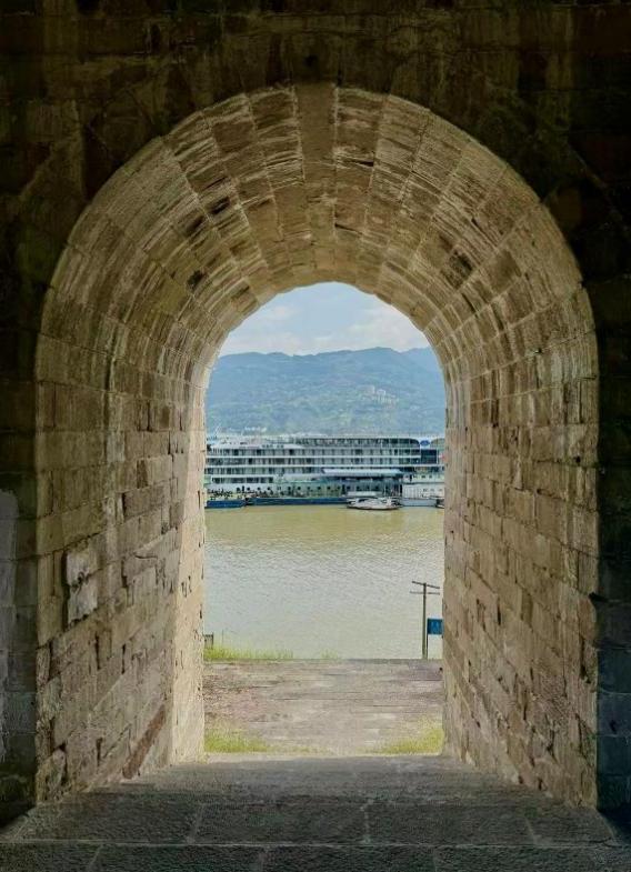 從奉節老碼頭的門洞里拍到停靠在寶塔坪旅遊碼頭的阿波羅號,古今交匯在鏡頭前。