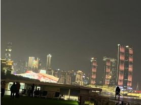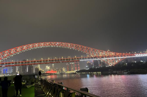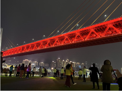 19:00 左右,遊輪起航了。登上遊輪六樓的甲板,欣賞重慶朝天門的夜景。朝天門被璀璨燈火點亮,宛如一顆鑲嵌在長江與嘉陵江之間的明珠,橫跨江面的大橋在夜色中猶如金色巨龍臥波,與對岸高樓構成錯落有致的天際線。