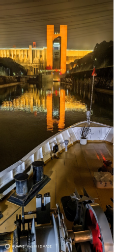 因為我們選擇的是名人套房,比爾蓋茨套房,位置是在三層西陵甲板船舷左側,拍攝升船機的角度是位于套房外的陽臺甲板。長江探索號在夜晚緩慢航行,船體逐漸貼右側,然后停船等待信號。全船的人都熱血沸騰,很多人都在頂層甲板激動的等待中。