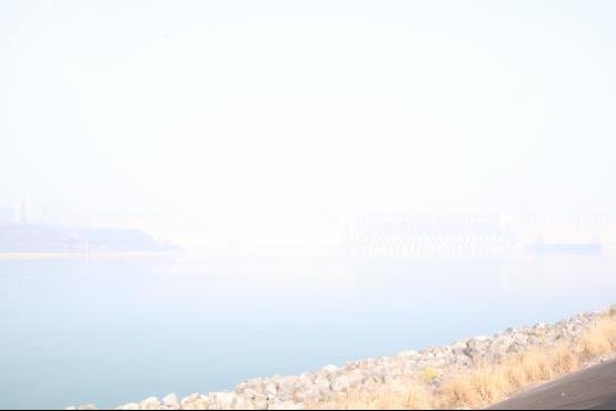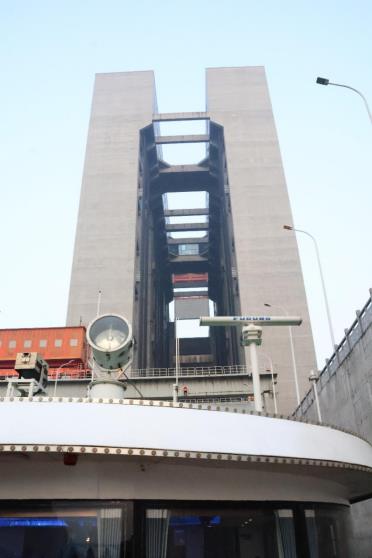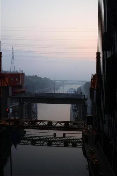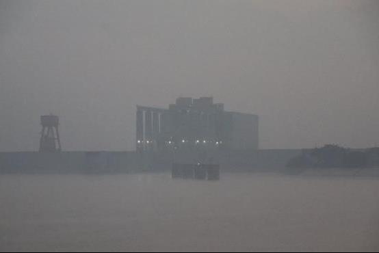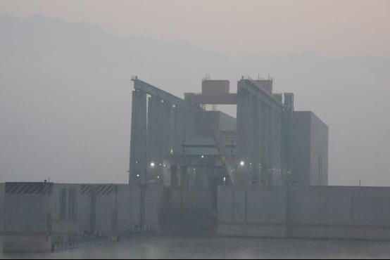 大霧籠罩著江面,但是遠遠的能看見升船機從大壩上高高的凸起。