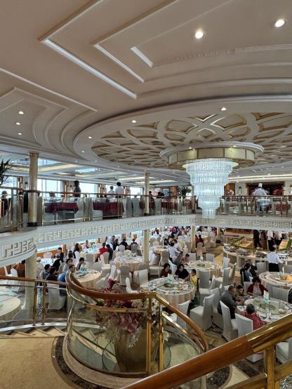 總統7號上下兩層中空餐廳,上面是付費餐廳,小桌不拼桌,下面是主餐廳,雖然拼桌,但也秩序井然。船方管理不錯,總統7號遊客的整體素質也比我們想象的高得多。