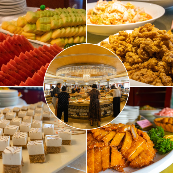 包含全程餐食:遊輪自助主餐廳+VIP餐廳分流用餐,中西自助每天換主題、變花樣,深夜食堂開到23:00,一天吃5頓;