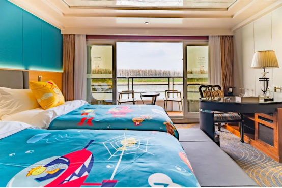 家庭房,位于4F、5F,共有8間,客房面積35㎡,附帶4㎡的獨立陽臺,有小朋友的獨立卡通床位,家庭房適合帶小朋友出行的遊客。