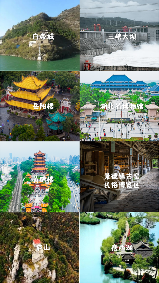 遊覽廬山、景德鎮、黃鶴樓、岳陽樓、三峽大壩等多個5A級景區。